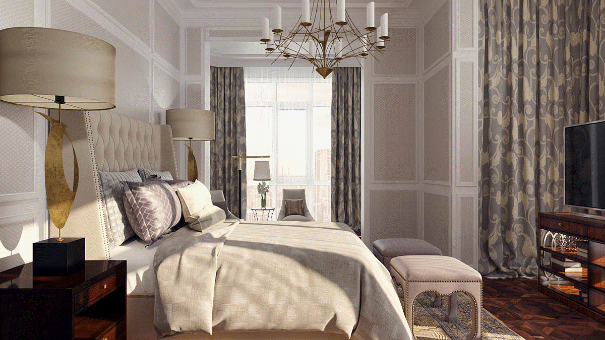 Trong không gian phòng ngủ thường được trang trí bằng những đường viền họa tiết lượn sóngTrong không gian phòng ngủ thường được trang trí bằng những tấm gương lớn với khung hình tròn và những đường viền họa tiết lượn sóng mềm mại. Đặc biệt là việc sử dụng những bình hoa không đối xứng cùng với những bức tranh trang trí Phục Hưng tùy chỉnh theo phong cách tân cổ điển cũng là gợi ý khuyên dùng cho nơi đây.