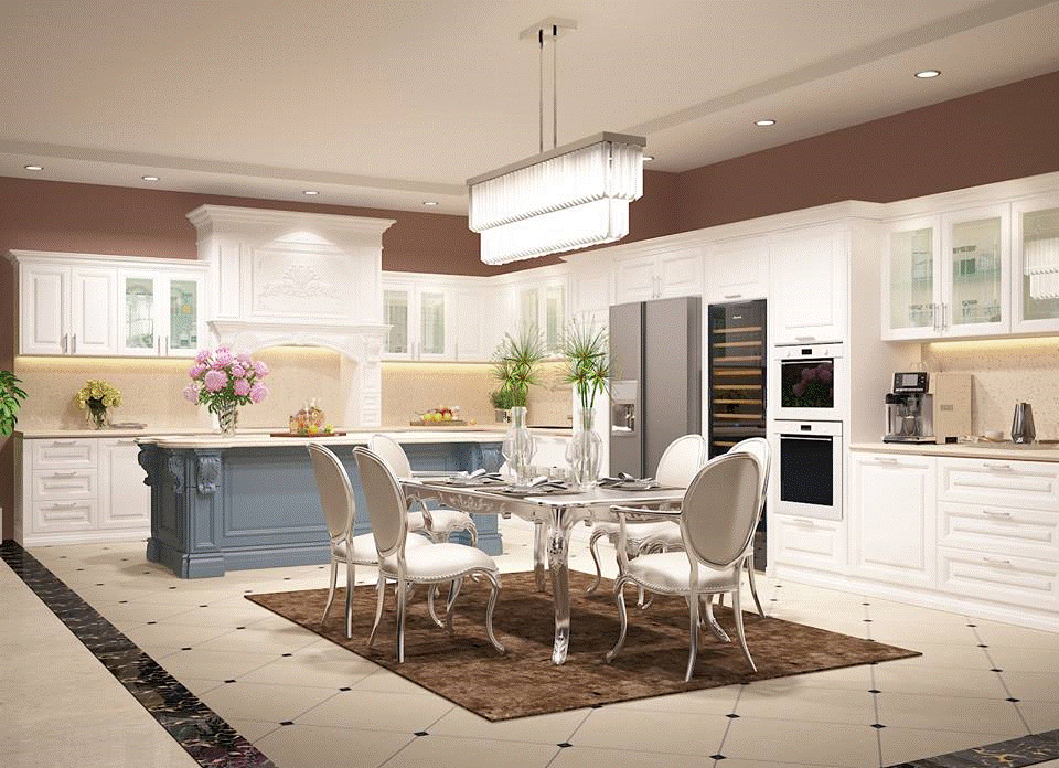 Phòng bếp trong thiết kế nội thất Pháp cần được toát lên phong thái sang trọngPhòng bếp trong thiết kế nội thất Pháp cần được thiết kế toát lên phong thái sang trọng nhưng không được thiếu đi sự gần gữi bởi đây chính là không gian lý tưởng để gia đình bạn quây quần và thưởng thức các món ngon sau một ngày. Đồ nội thất ở đây nên có các đường nét trơn tru và uốn cong khác nhau với các yếu tố mạ vàng. Khu vực phòng ăn có thể được trang trí với bàn kiểu truyền thống và ghế ngồi được thiết kế đẹp mắt. Nếu sử dụng bọc ghế thì nên sử dụng các loại vải đắt tiền như nhung, lanh và gấm. Ngoài ra bạn nên sử dụng gam màu vàng làm tông màu chủ đạo trong phòng bếp, bên cạnh đó bạn cần phải tận dụng tối đa ánh sáng tự nhiên để không gian trở nên thoáng đãng và tạo cảm giác thoải mái.