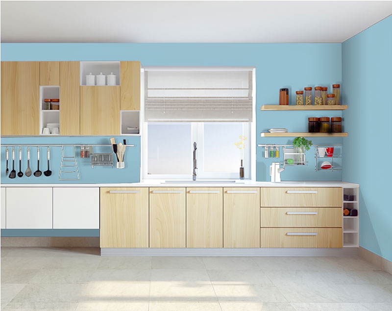 Sử dụng màu xám ghi toát nên phong cách thiết kế hiện đạiMàu xanh da trời gợi cho người ta cảm giác nhẹ nhàng, tươi mới và phóng khoáng mỗi khi nhìn vào. Một phòng bếp với màu xanh da trời làm chủ đạo sẽ là nơi thư giãn tuyệt vời cho bạn. Không những vậy tone màu này còn giúp bạn tha hồ thả mình vào thế giới hương vị tuyệt hảo của những món ăn.