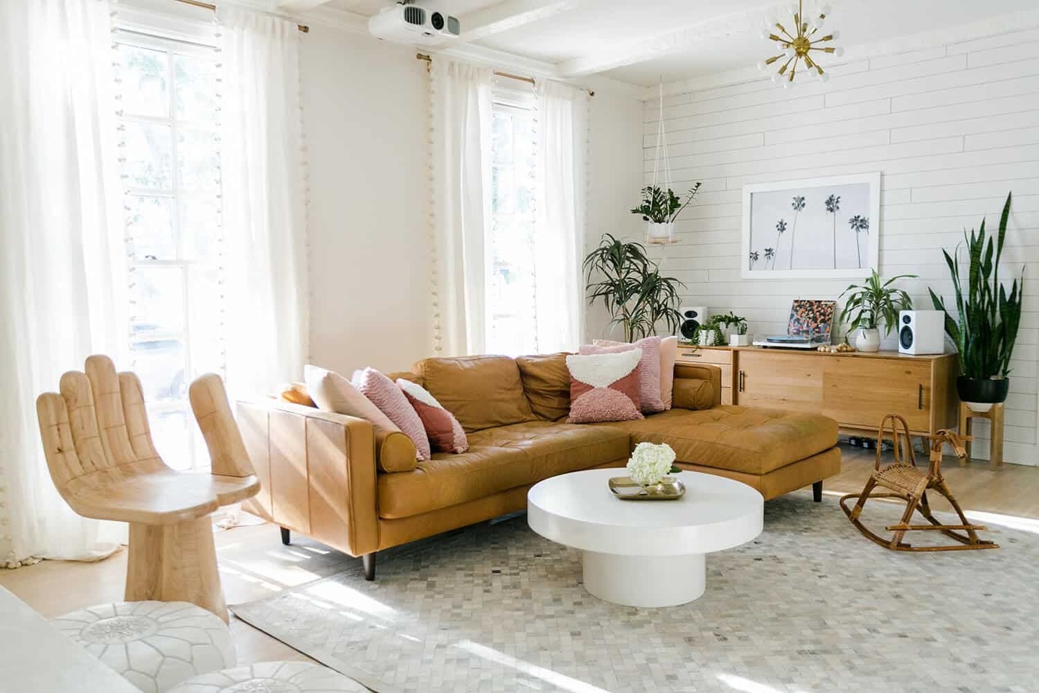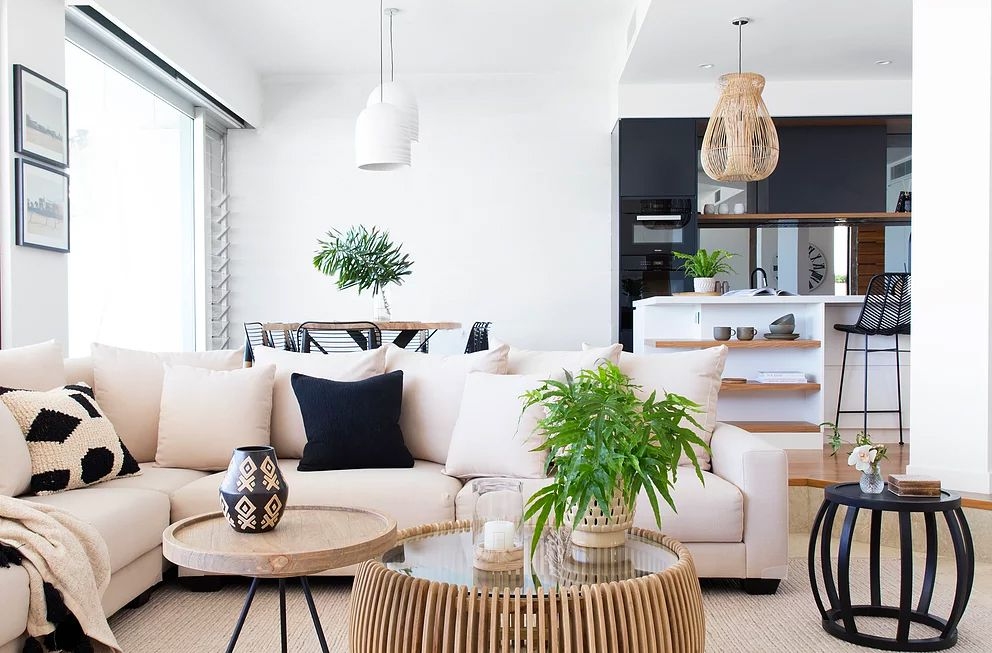 Từ thảm trải sàn cỡ lớn, gối trang trí sofa hay một tấm chăn ấm áp, những sản phẩm từ vải bố, sợi đan này sẽ giúp căn phòng trở nên sống động hơn, ai lại không thích cảm giác êm ái, mềm mại từ tấm thảm dưới chân. Mẫu phòng khách này có tất cả mọi thứ để tạo nên một không gian được yêu thích – cây xanh, ánh sáng tự nhiên, đồ nội thất phù hợp – nhưng tấm thảm cỡ lớn lấy cảm hứng từ phong cách Bắc Âu chính là chi tiết đáng giá khiến căn phòng trở nên đặc biệt hơn.