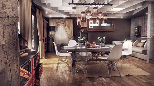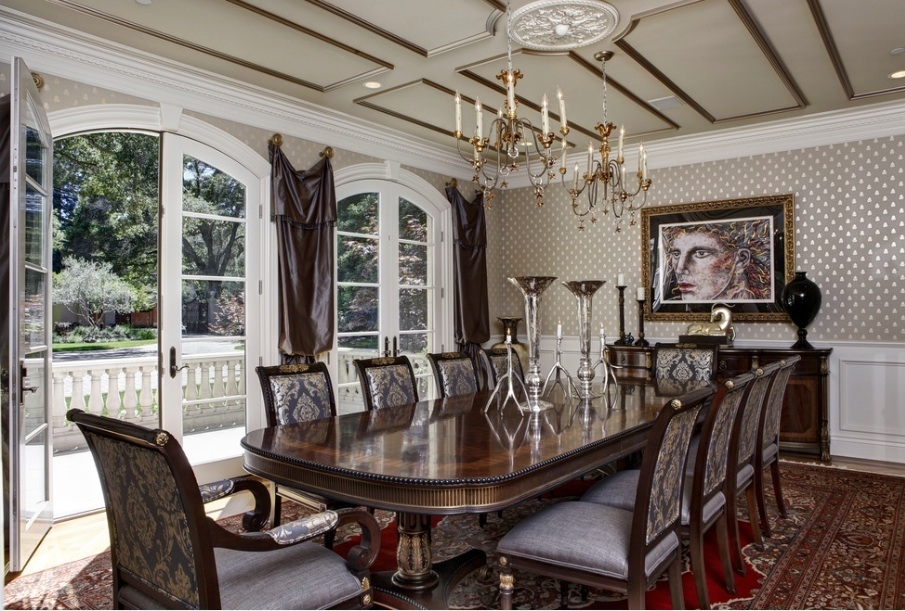 Phòng bếp lịch lãm với phong cách Gothic Một thiết kế phòng ăn cực kỳ lộng lẫy theo phong cách Gothic ánh sáng. Với một bộ bàn ghế ăn được làm từ gỗ tự nhiên, bạn sẽ có những bữa cơm cực kỳ ấm áp với gia đình mình. Thiết kế không kém phần huyền bí nhờ những đèn chùm, đèn tường và màu sắc trầm tối của gỗ. Tuy nhiên, việc sử dụng đệm nhung xanh hay bố trí một tấm gương phản chiếu mang đến sự sinh động hơn cho không gian. Toàn bộ phòng ăn có đầy đủ ánh sáng tự nhiên nhờ khung cửa kính nhìn ra sân vườn. Thiết kế này dành cho những căn biệt thự rộng, những căn nhà lớn có lối thiết kế cao và thoáng. Phòng ăn vô cùng sang trọng mà vẫn không quá lạnh lẽo phù hợp với gia đình nhiều thành viên.