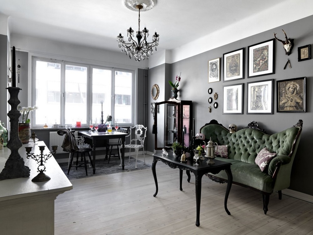 Phòng khách theo phong cách Gothic hiện tại cuốn hút, quyến rũPhòng khách luôn luôn là nơi mà bạn bước chân vào đầu tiên cho cả ngôi nhà. Với một phòng khách theo phong cách huyền bí và cổ điển, liệu bạn có cảm thấy bí bách và ngột ngạt hay không? Với không gian phòng khách này nội thất sử dụng sofa lớn để cân bằng với sự rộng lớn của không gian. Nền tường thường là những tông màu tối nhưng nhờ ánh sáng tự nhiên từ cửa sổ nên sẽ không mất đi sự sang trọng và tiện nghi. Màu sắc của sofa cũng thiên về những tông màu trầm với chất liệu nhung hoặc nỉ êm ái. Và đặc biệt, bàn trà thường là kiểu bàn kính tăng chiều sâu cho thiết kế. Trang trí phòng khách là những khung tranh tường ấn tượng. Có thể khẳng định đây là phòng khách mà bạn sẽ cực kỳ yêu thích.