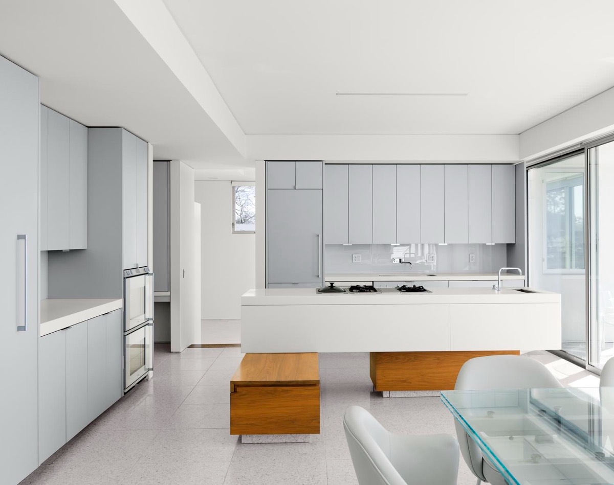 Sự pha trộn màu sắc và kết cấu của hệ thống tủ bếp Sáng tạo trong thiết kế này là sự pha trộn màu sắc và kết cấu của hệ thống tủ bếp. Mặc dù dễ dàng thêm các mảng màu vàng, đỏ hoặc xanh lá cây vào nhà bếp với màu trắng và xám, nhưng những điểm nhấn đầy màu sắc chắc chắn đã trở thành dĩ vãng. Thay vì màu sắc, hãy nghĩ đến những phong cách khác mà bạn có thể tạo ra sự tương phản mà không làm thay đổi sức hấp dẫn tổng thể của căn bếp xinh xắn được khoác lên mình những gam màu trung tính. Không nghi ngờ gì nữa, gỗ là một lựa chọn tuyệt vời vì nó vừa mang tính thời trang vừa mang lại một chút hương vị tự nhiên cho khung cảnh đương đại chủ yếu là vật liệu nhân tạo. Tủ gỗ và quầy bar ăn sáng dường như là sự lựa chọn phổ biến ở đây, sau đó là ghế quầy bar và kệ nổi.