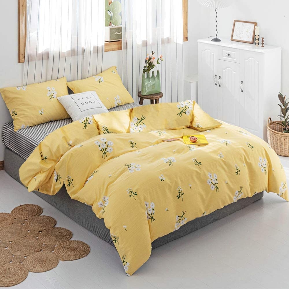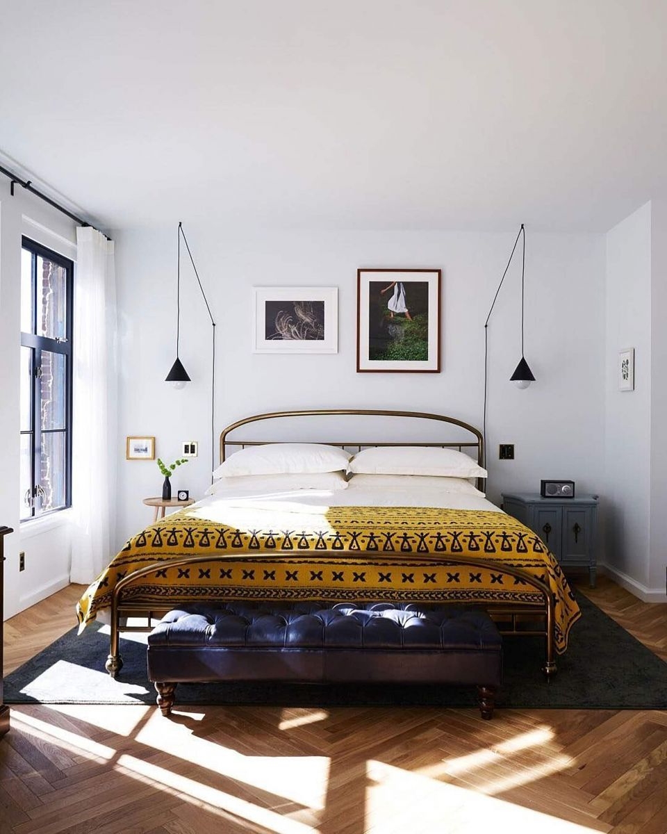 Một chút nắng vàng của mùa thu sẽ lay động tâm hồn bạnVới khung hình trên đây thực sự là một trong những ý tưởng tuyệt vời về kết hợp màu sắc. Màu vàng đậm của tấm trải giường “trộn lẫn” với tấm thảm đen và ghế da nghe có vẻ hơi nặng nề. Tuy nhiên khi kết hợp cùng những bức tường màu trắng xám và khăn trải giường màu trắng và tủ đầu giường màu xanh lam xám, cho tổng thể căn phòng trông thật nhẹ nhàng và mộc mạc.B. Màu Vàng Kết Hợp Với Các Màu Trung Tính