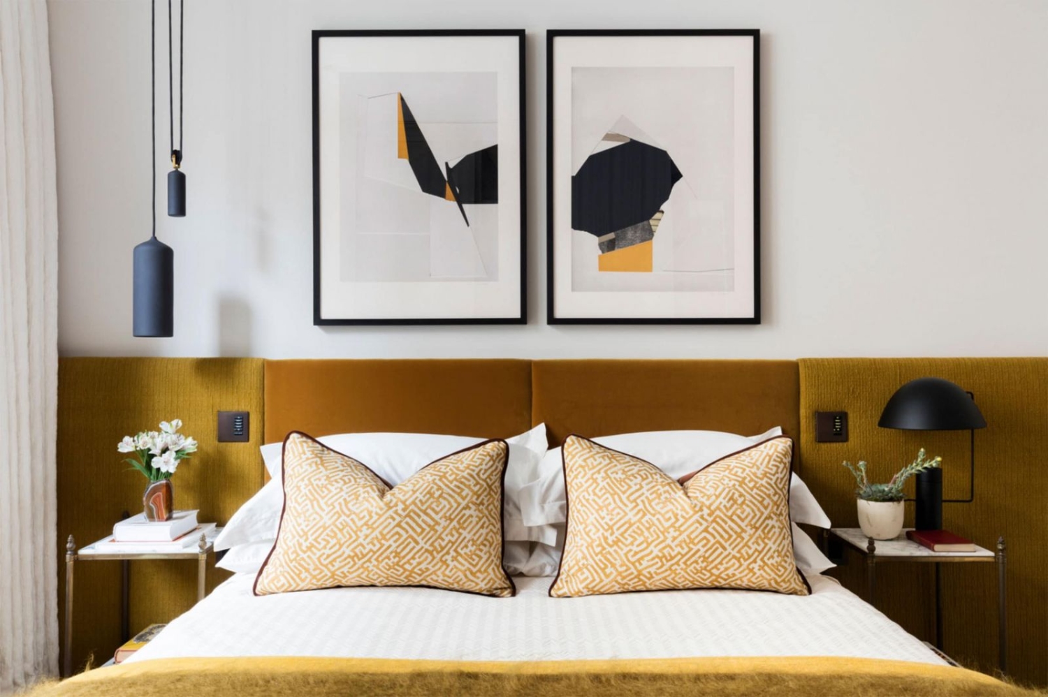 Màu vàng luôn là ý tưởng decor nội thất tuyệt vờiVới ý tưởng khá đơn giản này về cách sử dụng màu vàng trong thiết kế nội thất chỉ cần phối hợp nó với một loạt các màu trung tính. "như bức ảnh trên một căn phòng của Studio Ashby" mang đến sự lung linh thông qua chất liệu vải dệt kim được may khéo léo tạo nên những ô hình tuyệt đẹp, để tạo ra sự pha trộn ngắn gọn với bức tường trắng tạo ra thứ ánh sáng ảo diệu hơn giúp mọi góc trở nên hài hòa với một chút điểm nhấn màu đen (tranh treo tường, đèn ngủ) sẽ mang đến vẻ hiện đại hoàn mỹ tổng thể cho căn phòng.C. Màu Vàng Kết Hợp Xanh Mòng Két